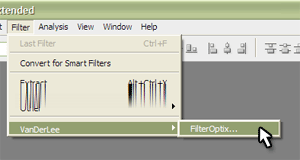 How to FilterOptix depends on which graphics application you're using. Pictured here is Photoshop. Most graphics applications will have a menu or submenu labeled "Filter(s)" and in it you'll find the "FilterOptix" option in the "VanDerLee" category.